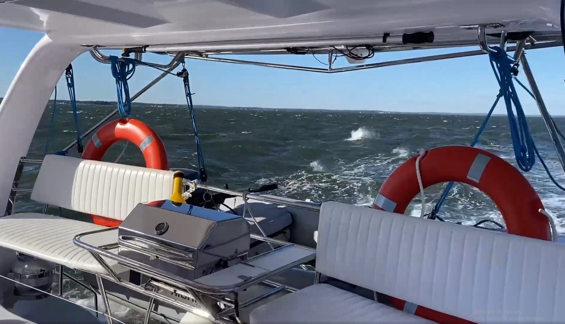 Once we got into the river the winds were solid above 25kts. We tried putting up the main to sail out of the river but we kept wind-vaning the boat to upwind and couldn’t get her to turn downwind to leave the river. And since it would have been a straight downwind run to sail out of the South River with multiple gybes, I decided to just drop the main and motor out of the river. Once we got out and had more room to get her setup, we raised the main to the 3rd reef, set the 3rd reef in the jib and took off south on a nice beam reach wavering about 7.5kts with top speeds of about 10.5!