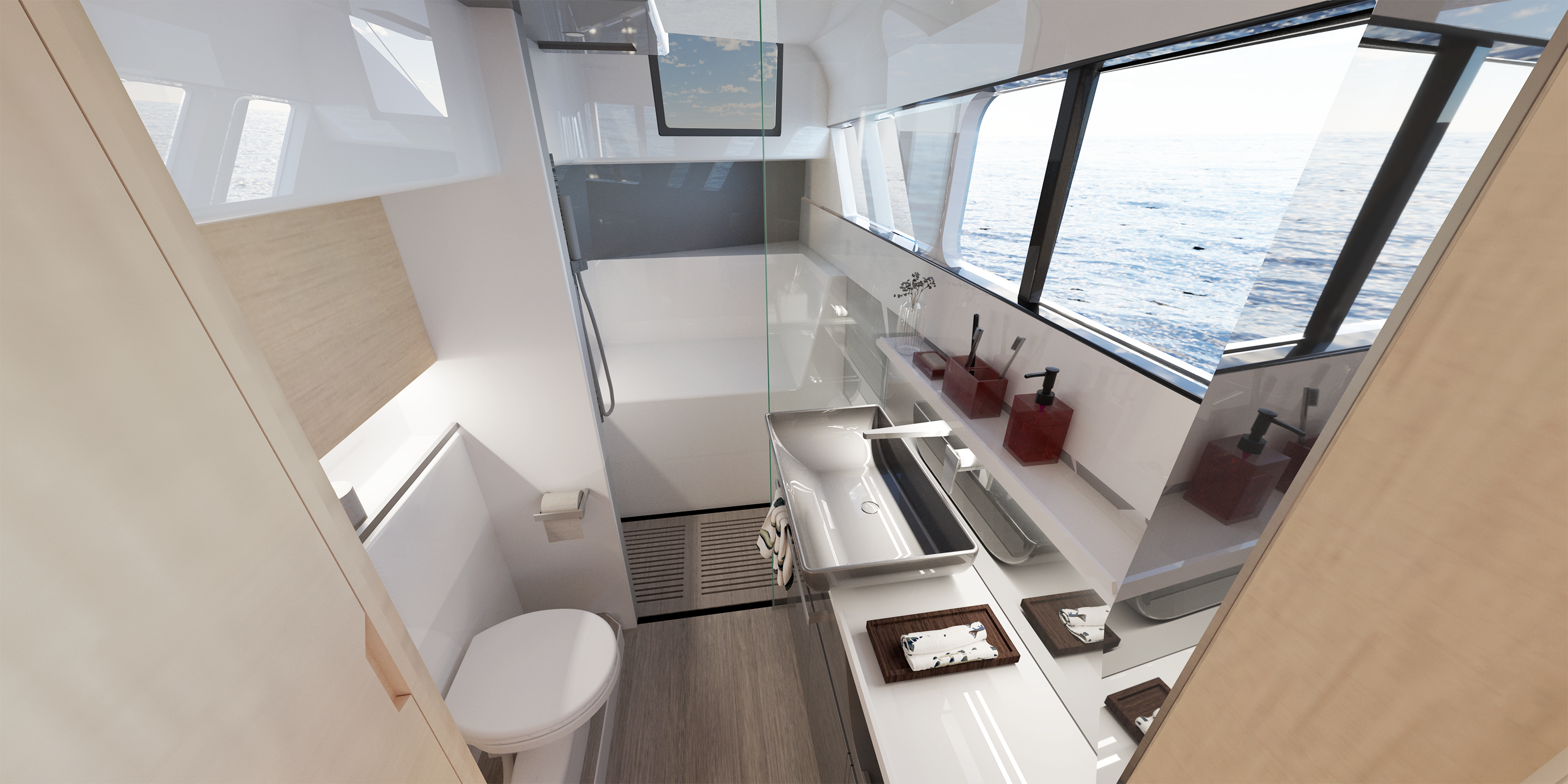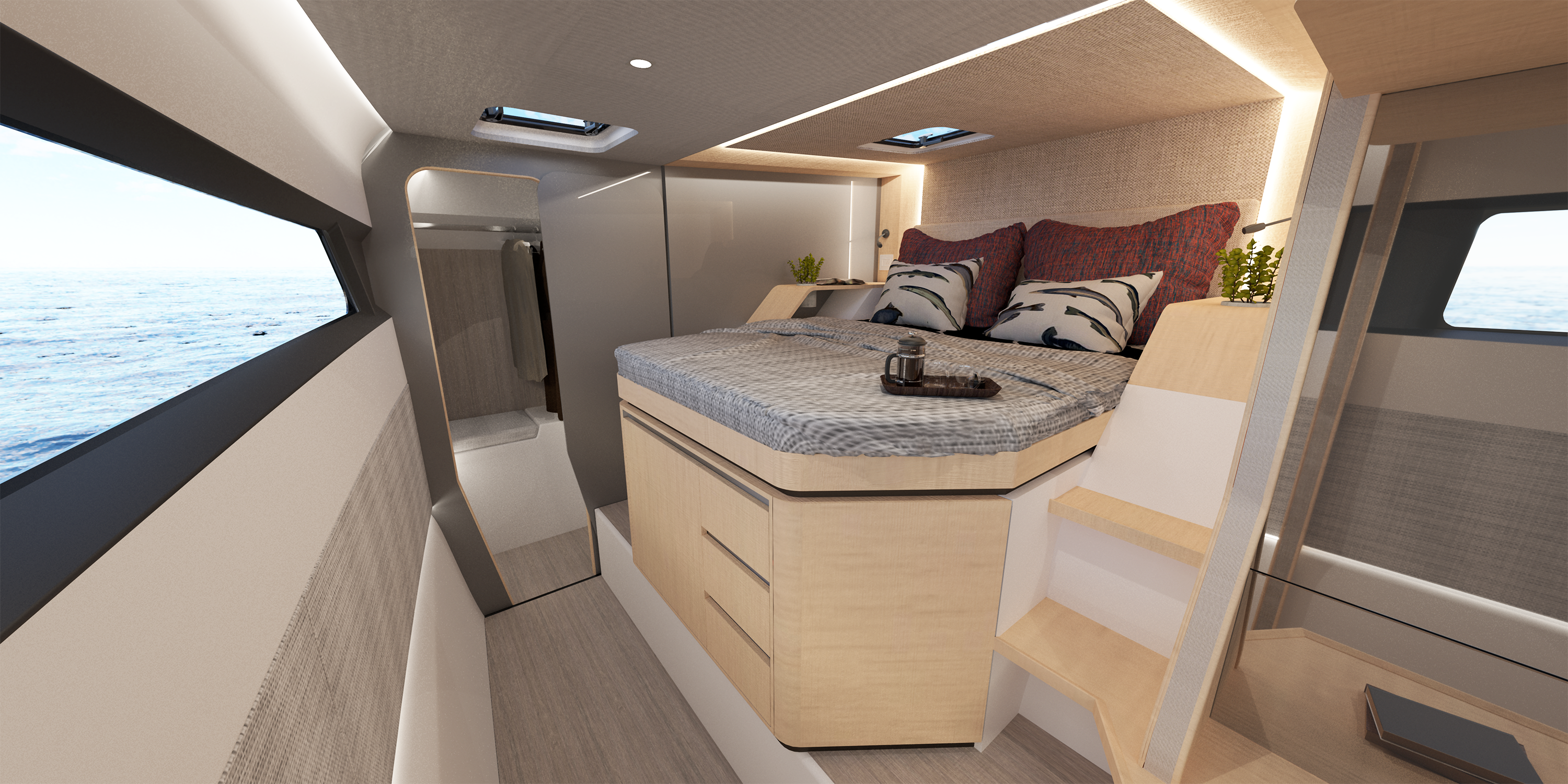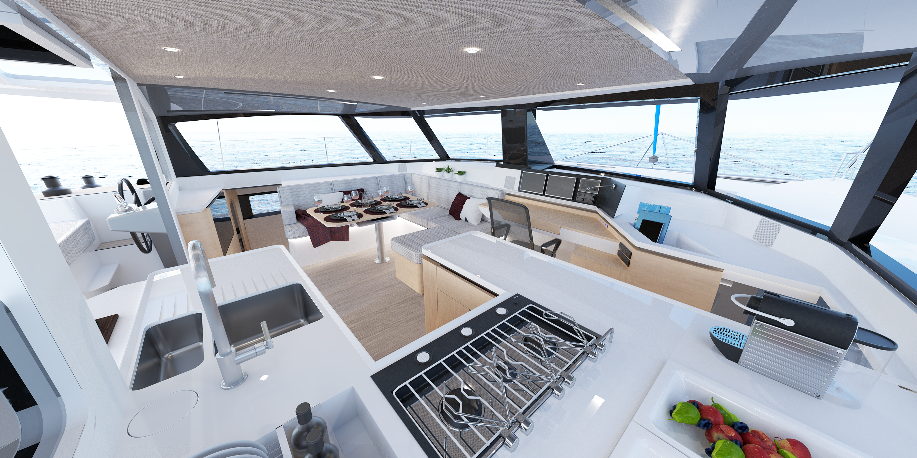 This exciting model is a perfect combination of the 41ft Seawind 1260 and the 52ft Seawind 1600. It provides the best features of single level twin helms, tri-folding doors and indoor/outdoor spaciouness yet includes flat deck, high headroom in cabins and efficient hull shape. Its tri-fold door allows the cockpit and saloon to merge into a big open space, which can also be closed for security and warmth in changing weather conditions. Its toughened glass windows can be opened for natural light and ventilation. Furthermore, the master suite allows for a queen-sized bed, walk-in wardrobe and the cockpit features a stylish cocktail bar and spacious transom lounge.