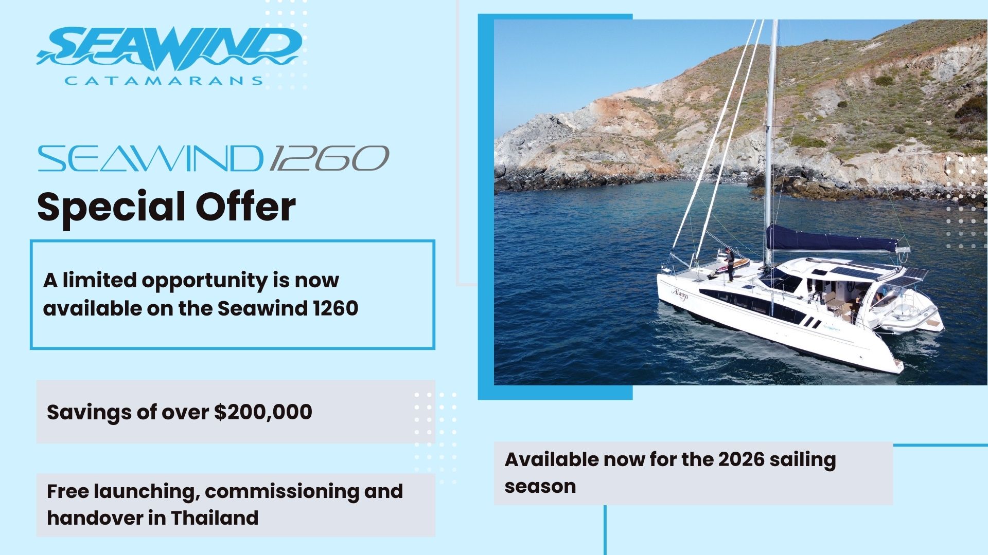 A limited opportunity is currently available on the Seawind 1260, created as part of a planned transition to accommodate upcoming production.
