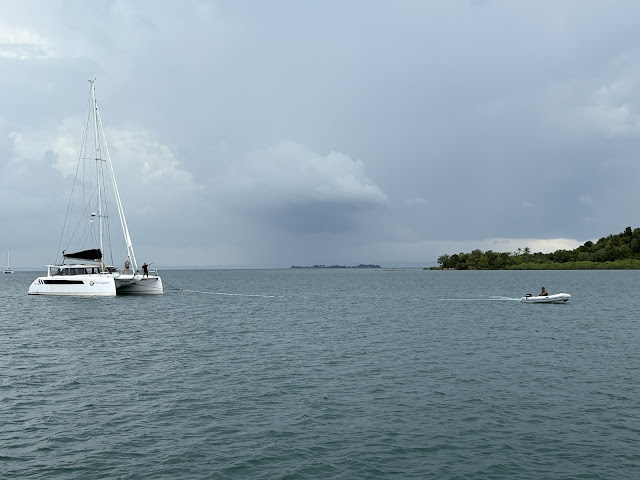 When the engine problem on NO MORE TEARS persisted the next day, Sunday, 16 November, only NSMA was left to tow. We set off again at first daylight, our next destination being a bay named Tanjung Balai, a good 50 nautical miles away. When a squall hit and there was lightning overhead, all of us felt tense….the thunderstorm lasted a good two hours, and on NISMA we disconnected the VHF co-axial cable going to the mast (which was one of the major paths of the lightning that struck NO REGRETS) and put laptops and phones in the oven to create a Faraday cage. Fortunately, this time we all were spared.